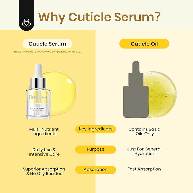 - Groundbreaking Water-Oil Fusion for Face-Level Nourishment: Presenting BT's groundbreaking face-level nourishing serum tailored for nails, our Cuticle Serum integrates hydration, nourishment, and moisture in one revolutionary formula. It offers a spa-inspired pampering session for your nails, resulting in soft, smooth, and healthy nails.