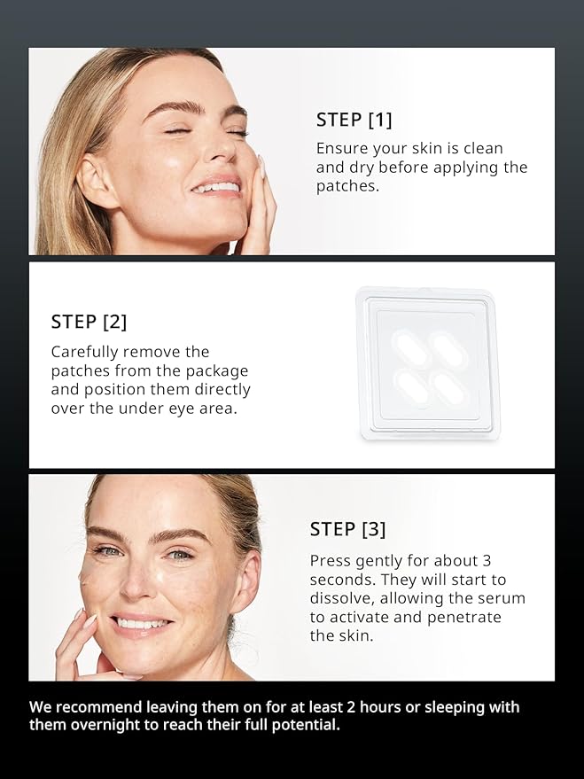 - [ How to Use ]: Carefully remove the patches from the package and position them directly over the desired area, press gently for about 3 seconds. They will start to dissolve, allowing the serum to activate and penetrate the skin. We recommend leaving them on for at least 2 hours or sleeping with them overnigh.