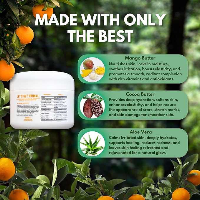 - DEEP MOISTURIZATION: Made with cocoa butter, mango butter, aloe & more - your skin will thank you for the hydrating and nourishing ingredients in our PRIMALS body lotion. Say goodbye to dry, ashy skin!