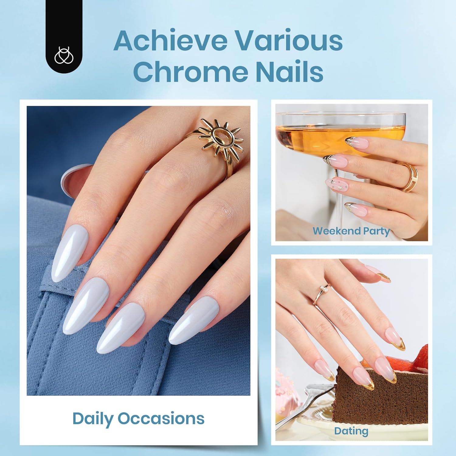 - Easy to Use: Simply apply the wipe-free gel topcoat to the base color, cure under the LED UV lamp for 30 seconds, and then apply your favorite chrome or pearl powder. Finally, seal with a topcoat and cure under the lamp for 60 seconds to complete the look. You can apply powder repeatedly. If you are not satisfied with the style after applying powder, you can wipe it off with alcohol and then apply powder again!