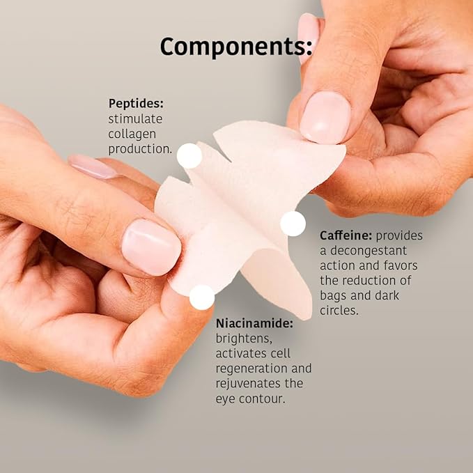 - EYE PATCHES KEY INGREDIENTS: they contain niacinamide, which illuminates, activates cell regeneration and rejuvenates the eye contour; caffeine, which provides a decongestant action and favors the reduction of puffiness and dark circles; and peptides, which stimulate collagen production reducing wrinkles