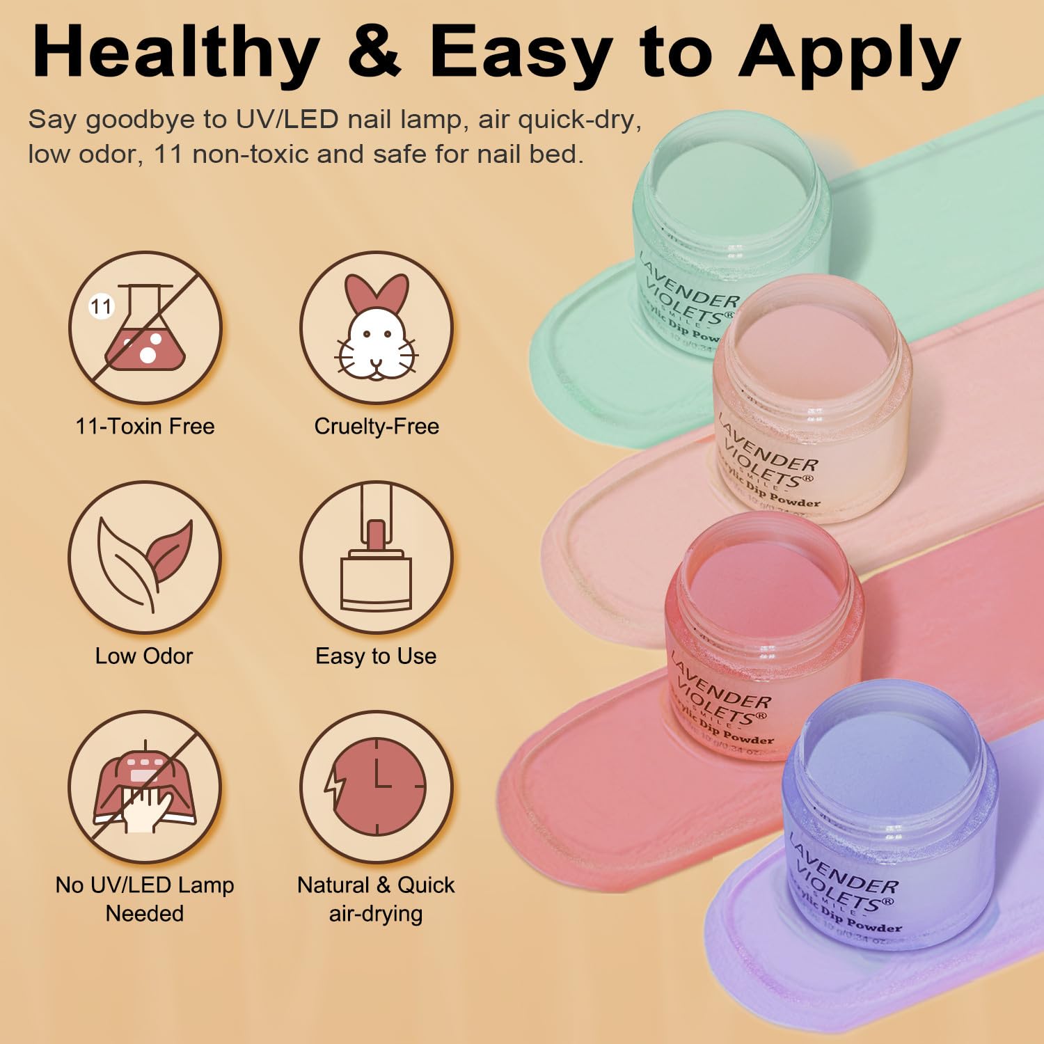 - Healthy Dip Manicure: Crafted with 11 toxin-free ingredients, the LAVENDER VIOLETS dip powder nail kit is safe for your natural nails. It features low odor and contains no harsh chemicals or adhesives, ensuring a healthier manicure experience.