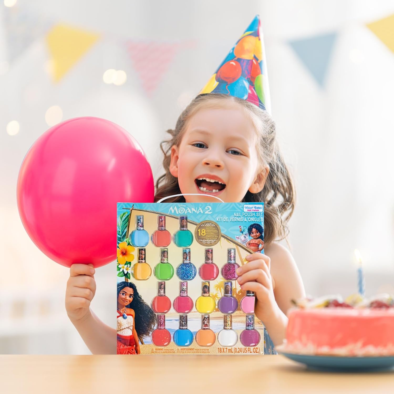 - SET INCLUDES: 18 bubble gum scented, peelable nail polish bottles with glittery and opaque colors. Shades include gold, red, yellow, pink, blue, purple, and so many more colors! Each bottle decorated with Moana, Maui, Pua, and more of her friends.