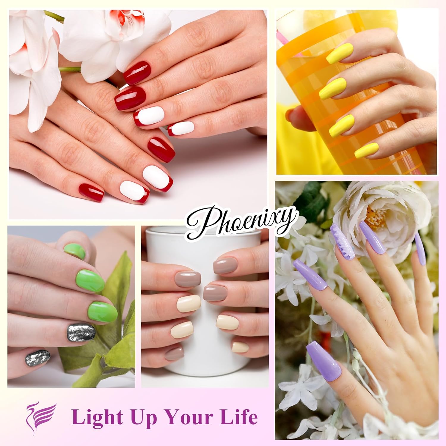 - [High Quality& Long Lasting] Made of natural resin, Phoenixy gel nail polish contains botanical ingredients and lowest smell, harmless to skins or nails. The higher quality promises better adhesion and gloss, smooth application and strong color-locking ability. The nail polish can last more than 3 weeks with proper application (keep your nails clean with file and buffer before applying base coat). Take a skin test before use. If any discomfort or allergy occurs, please stop using it immediately.