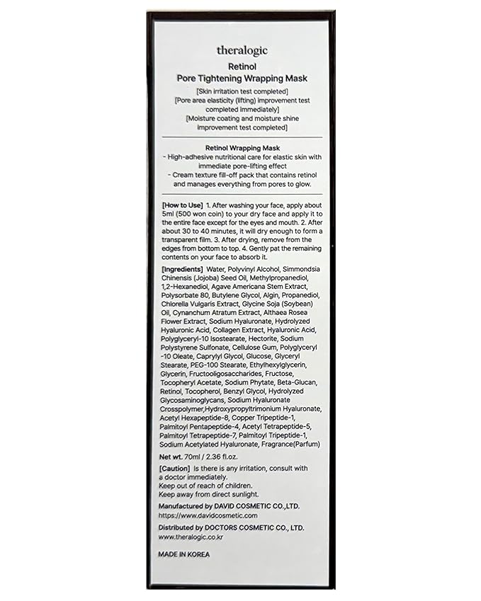 Retinol Pore Tightening Wrapping Mask - Korean Pore Elasticity Peel Off Mask with Collagen, Peptides, Hyaluronic Acid - Firming & Skin Glow Mask - Vegan, Derma Tested, 2.36oz.