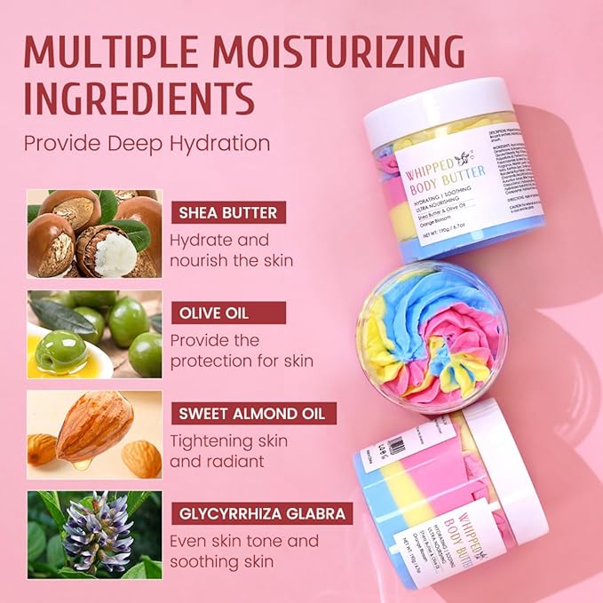 - 【Quick Absorption without Greasy】With lightweight and smooth texture,the whipped shea butter for body absorbs quickly without leaving a sticky and greasy feeling on the skin.You will feel a refreshing touch when you use this moisturizing body moisturizer for women, without any burden