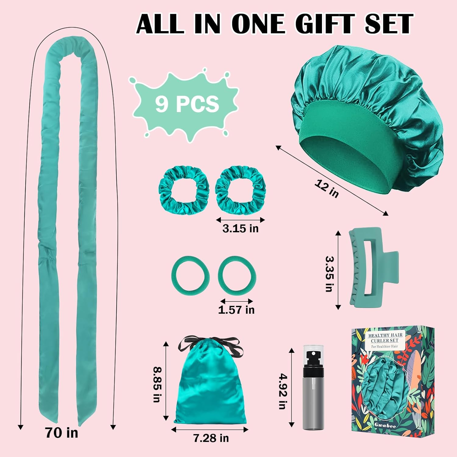 - Thoughtful Set for Women: Our heatless curling set includes 9 items: 1 x 70-inch long satin curling rod headband, 1 x satin hair bonnet for sleep, 1 x hair clip, 2 x satin hair ties, 2 x elastic hair ties, 1 x satin storage bag, and 1 x spray bottle. This all-in-one curling rods set is packaged in an exquisite box, making it the perfect present for your wife, mother, daughter, friends, or colleagues