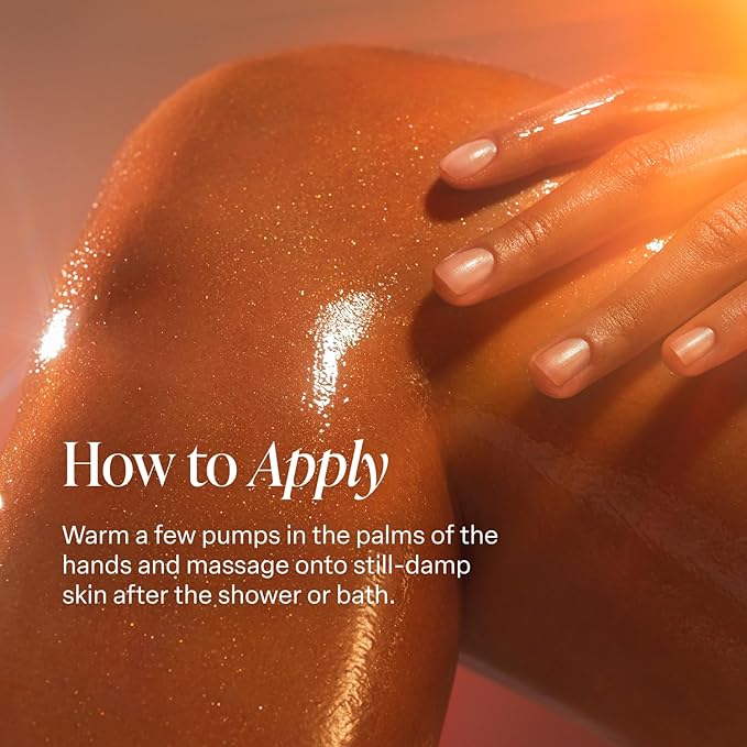- EASY-ABSORB FORMULA: Our shimmering glow oil penetrates the skin without leaving a greasy feel, while light-reflecting golden pearl pigments give you a healthy sun-kissed glow. Simply warm a few pumps in the palms of the hands and massage onto still-damp skin.