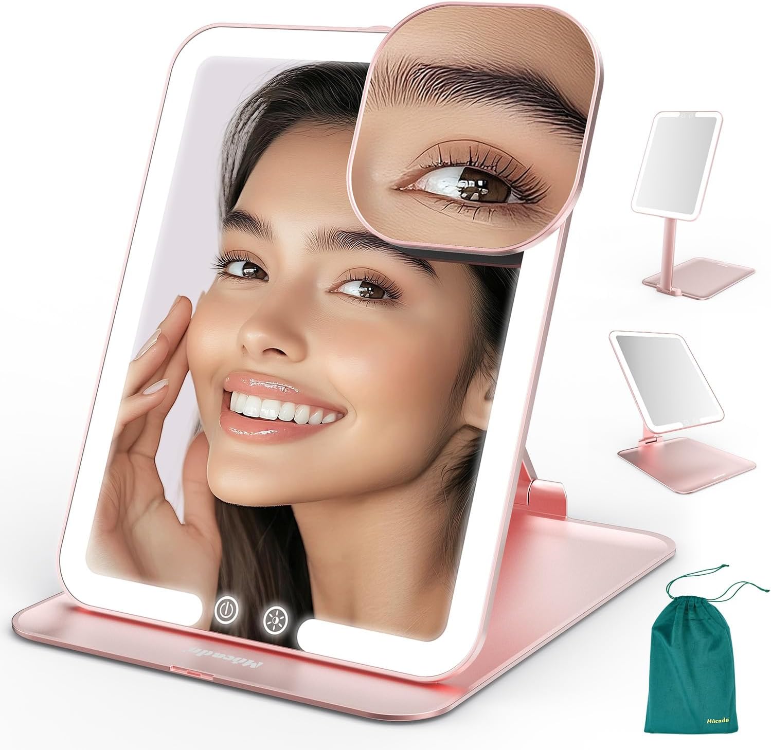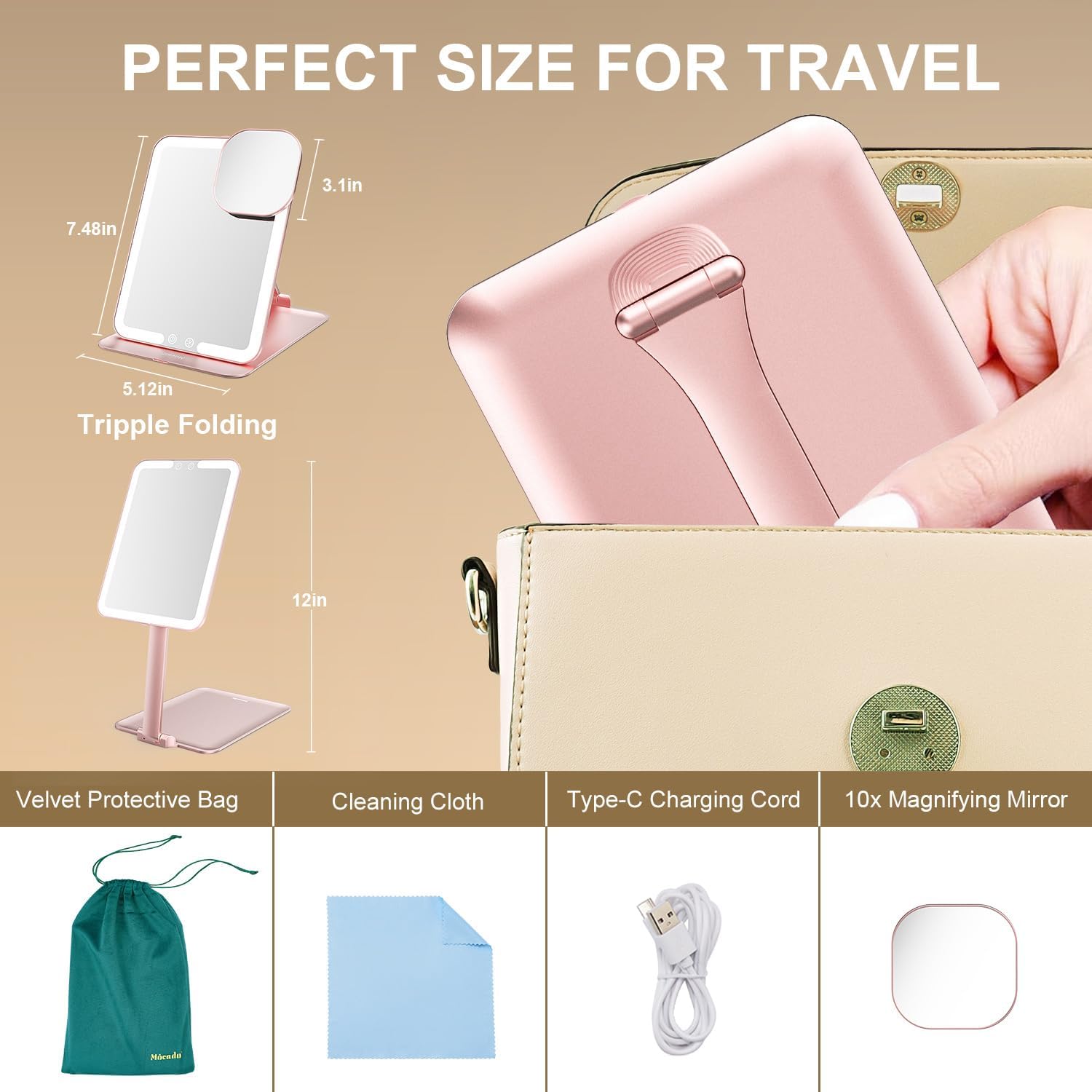Mocado Travel Makeup Mirror with Light - 7x5 Inches Tripple Folding Travel Mirror with Light, 3 Colors Lighted Makeup Mirror, Portable Makeup Mirror, Freely Adjust Height and Angle(Rose Gold)
