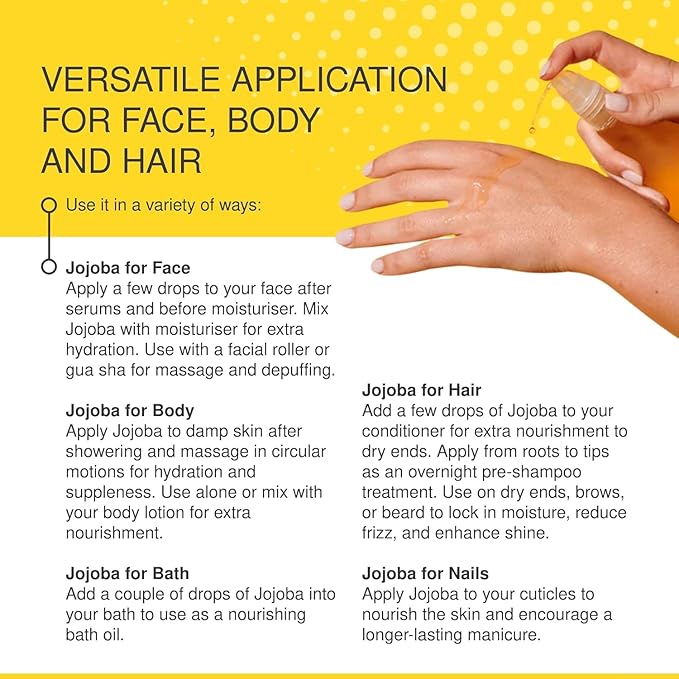 - 📌MIMICS SKIN'S NATURAL OILS FOR BETTER ABSORPTION– Unlike many other oils, jojoba is a natural liquid wax ester, closely resembling the skin’s sebum. This makes it fast-absorbing and ideal for daily skincare routines, helping to maintain skin balance without clogging pores.