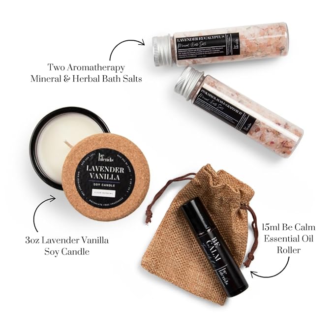 - This spa gift set for women includes a 3oz Lavender Vanilla Candle, a 10ml Be Calm Essential Oil Roller with lavender, bergamot, and roman chamomile, 50ml Lavender Eucalyptus Bath Salt, and a 50ml Pink Himalayan & Grapefruit Bath Salt for relaxation.