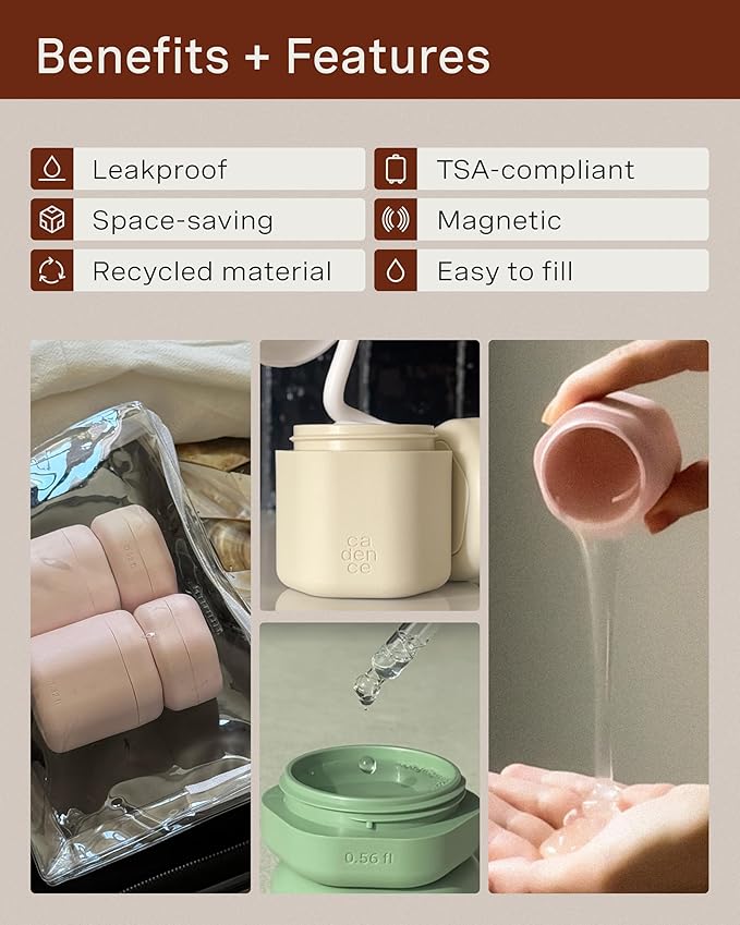 - TAKE YOUR SKINCARE ANYWHERE: Introducing Cadence’s Core Skincare Set. The perfect leakproof travel containers to hold your skincare routine for when you’re on the go. Each capsule comes with a labeled tile: Cleanser, Moisturizer, Serum, Makeup Remover and Sun-Icon labels.
