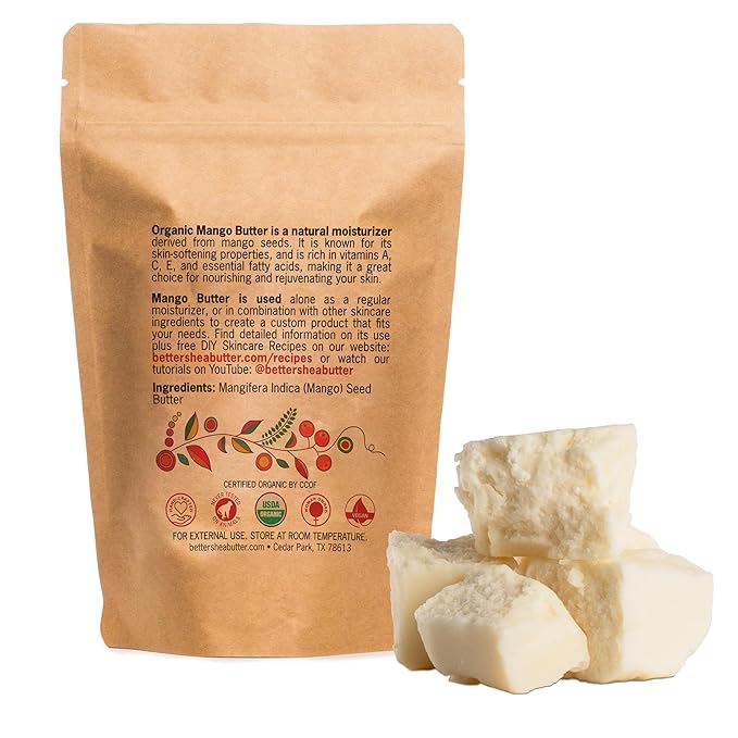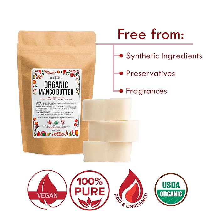 - Organic Mango Butter : Experience the purity of mango butter raw organic unrefined, a versatile ingredient for soap making supplies, a lotion making kit or body butter making supplies. This certified organic raw butter is cold pressed to retain all its natural benefits, making it perfect for a homemade lotion bar, natural body lotion and hair butter.