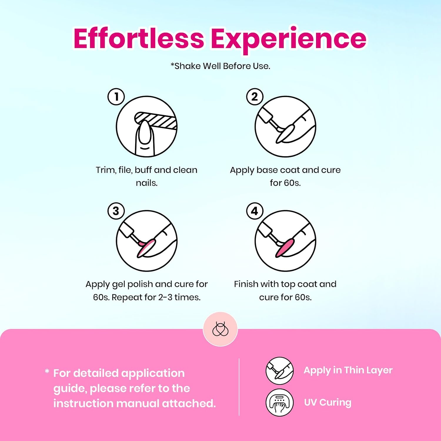 - Easy to Use: The bright gel nail polish kit are safe and with low odor, rich color, middle consistency, self-evenly, no shrink and edge. Easy to apply, suitable for beginners and professional nail salons. It can be matched with different styles of clothing, and can accompany you to the workplace, outdoors, rural scenery, seaside vacation.