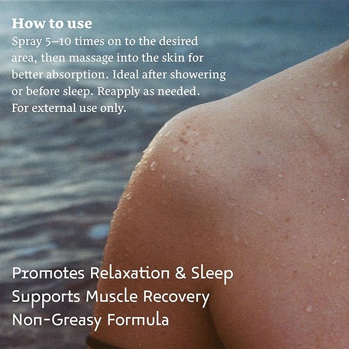 - EASY TOPICAL APPLICATION FOR MAXIMUM BENEFITS: Simply spray magnesium oil 5–10 times onto the desired area and massage into the skin for enhanced absorption. Ideal for use after showering or before sleep. Reapply our pure magnesium oil spray as needed. For external use only; avoid contact with eyes and discontinue use if irritation occurs.