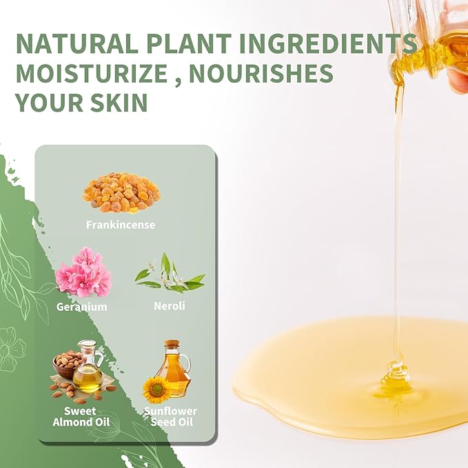 - Frankincense Body Oil: Enjoy the complex blend of natural plant oils and essential oils, with Sweet Almond oil, Sunflower Seed oil, Frankincense, Geranium and Neroli essential oils to soothe and nourish, leaving your skin looking and feeling youthful