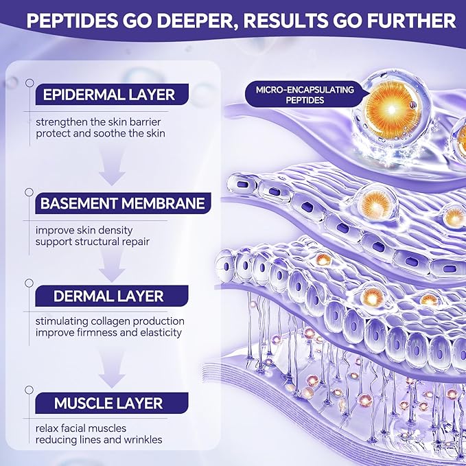 - Advanced Multi-Peptide Serum: Features a cell-membrane-like polymer structure, micro-encapsulating peptides with transdermal technology provides controlled release, allow facial serum to penetrate multiple layers to combat dehydration & dull skin.