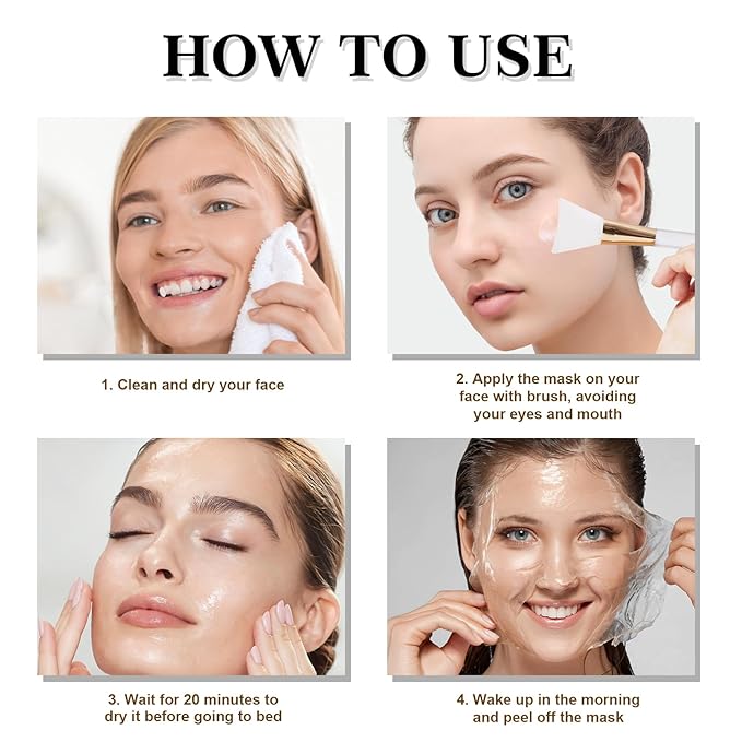- 【Easy to Use】Apply the collagen mask evenly by the included silicone brush after cleansing and toning,waitting for 20 minutes to dry it before going to bed,(avoid your eyes and mouth). get up and gently peel off the mask or rinse with warm water.
