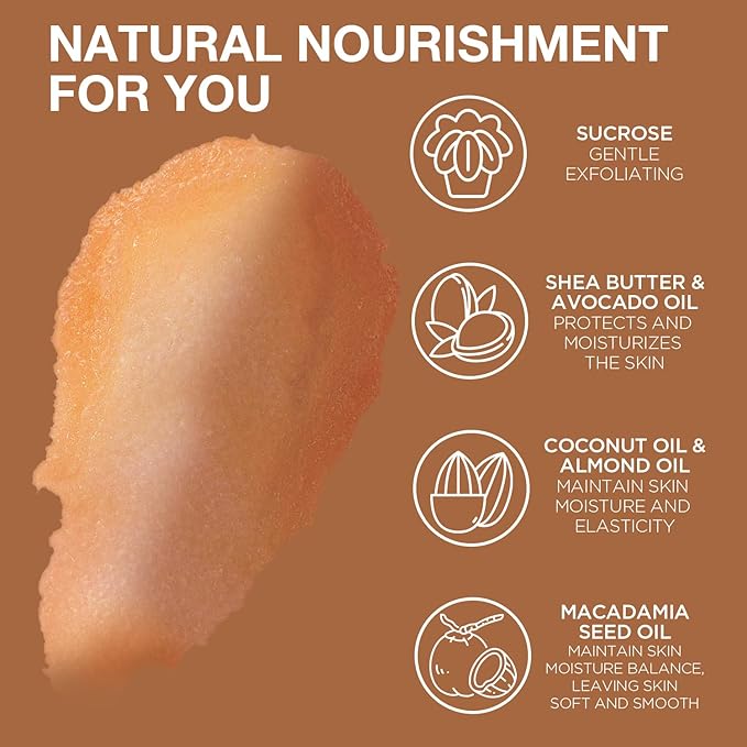 - GENTLE EXFOLIATING: Our specially formulated blend of sugar and natural plant oils helps you gently exfoliate dead skin, cleans excess oil and dirt from pores, revealing a clear and smooth appearance. Simply apply our body scrub in circular motions on wet or dry skin, apply even coverage and rinse off to enjoy silky smooth skin.