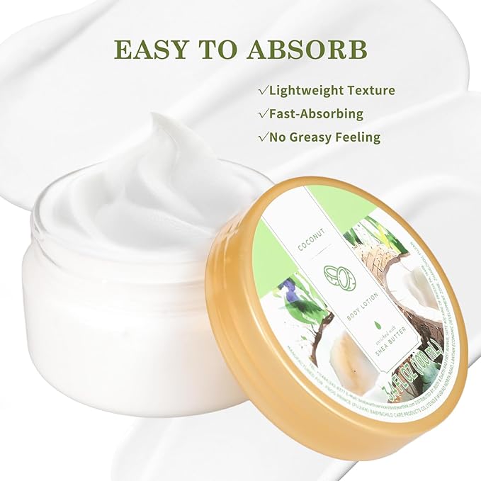 - EASY TO ABSORB: The Coconut Body Lotion has a fast absorbing, non greasy formula that can be quickly absorbed into the skin without leaving any greasy or viscous residues, providing hydration for a whole day. Let you enjoy the convenience of body lotion without leaving any greasy feeling.