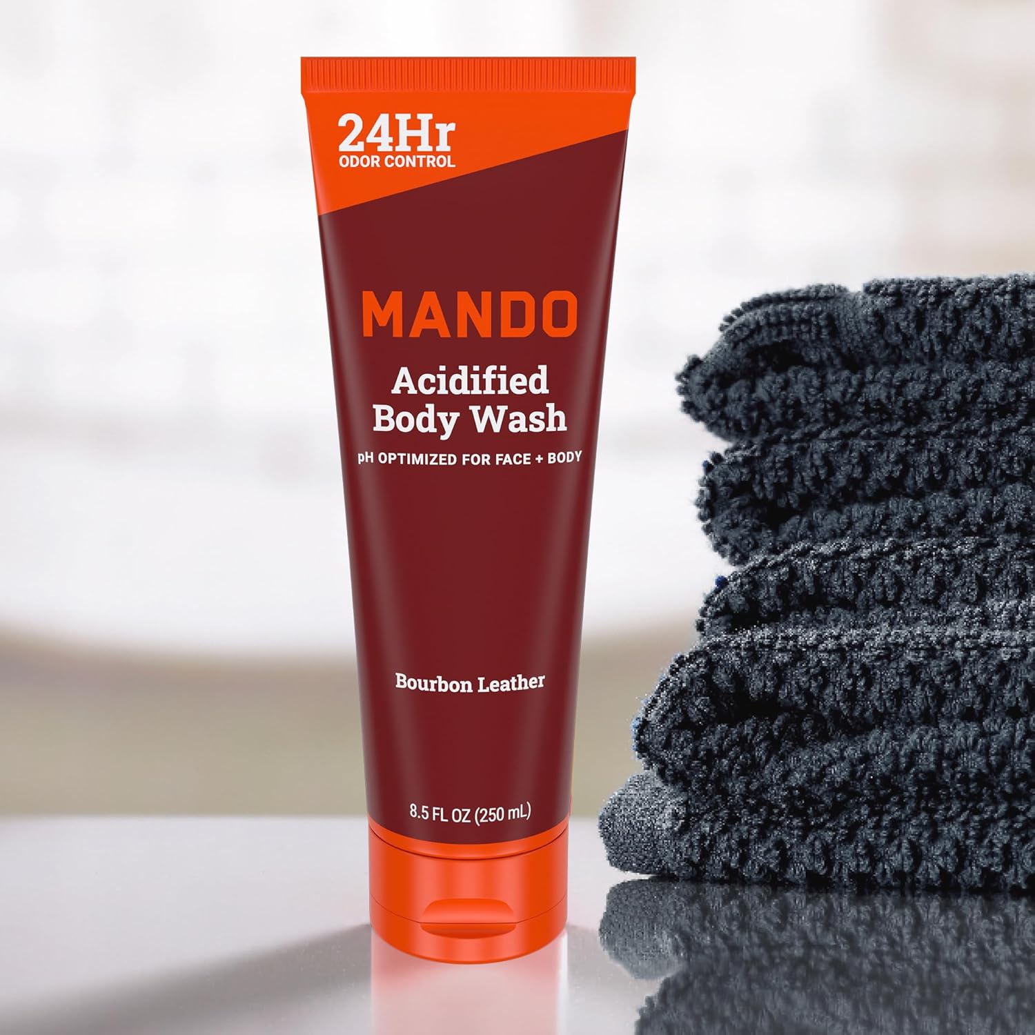 Mando Odor Shield Body Wash - 24 Hour Control - Removes Odor Better than Soap - SLS Free, Paraben Free, Skin Safe - 8.5 Ounce (Pack of 2) (Bourbon Leather)