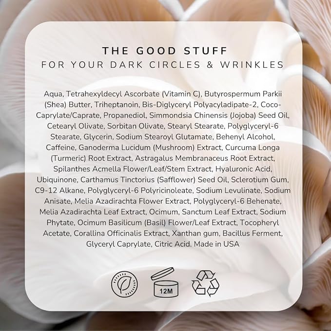 - POWERFUL PLANT-BASED INGREDIENTS – Reishi Mushroom and Caffeine work together to visibly reduce dark circles and signs of fatigue. This vegan eye brightener revives tired eyes with nature’s most effective ingredients.