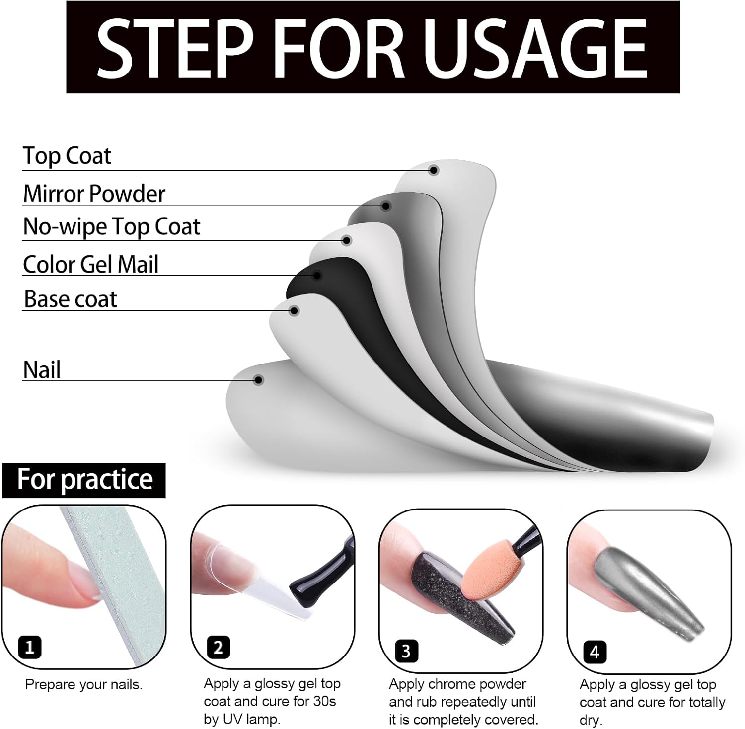 - The Scope Of Application:All chrome powders should only be applied to glossy No wipe top coat to embellish Nail-Polishes color. Otherwise it is unusable, it can't be applied directly to the nail, and it can't be applied directly to the skin. Artdone chrome powder can be applied on UV gel nails, acrylic nails or false nail tips. You can use them very easily