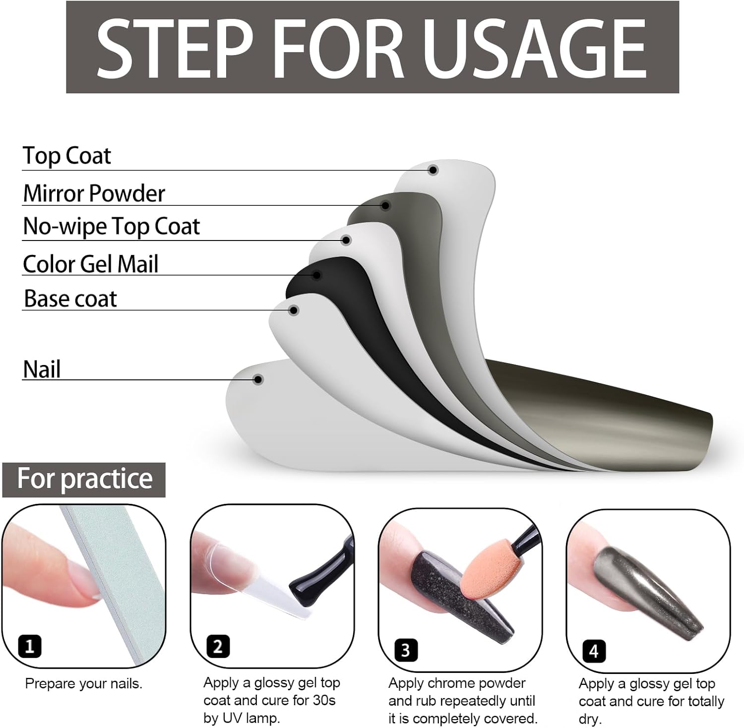 - The Scope Of Application:All chrome powders should only be applied to glossy No wipe top coat to embellish Nail-Polishes color. Otherwise it is unusable, it can't be applied directly to the nail, and it can't be applied directly to the skin. Artdone chrome powder can be applied on UV gel nails, acrylic nails or false nail tips. You can use them very easily