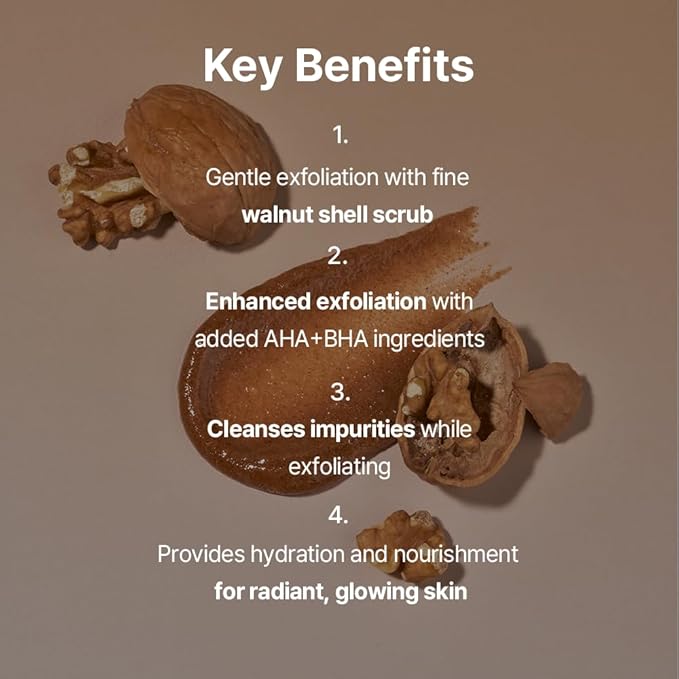 - [Gentle Exfoliation Without Irritation] Harsh scrubbing can strip away even the healthy layers of skin, leading to sensitivity. No need to worry—finely ground walnut shell particles gently remove only dead skin cells without causing irritation.