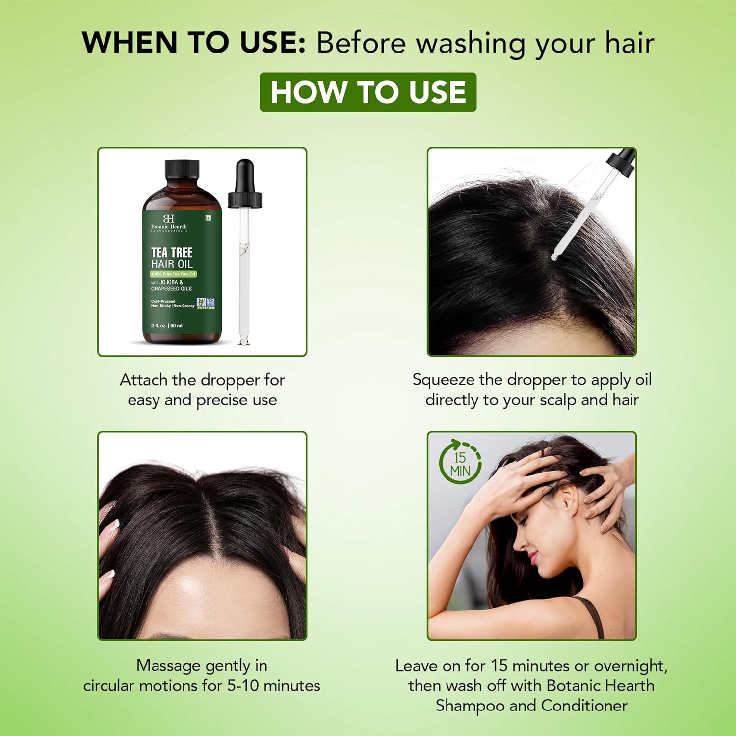 Botanic Hearth 100% Pure Tea Tree Oil (2 Fl Oz) | With Jojoba & Grapeseed Oils | Soothes Itchy Scalp & Fights Dandruff | Hair Oil Repairs Dry Damaged Hair, Strengthening, Healthier Hair- Hair Tonic