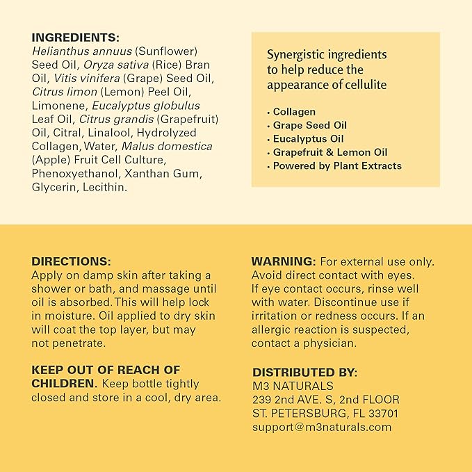 - Revitalizing Lightweight Formula: M3 Anti Cellulite massage oil gives your skin deep hydration without the heavy & sticky feeling from typical body oils. Add a lightweight oil warmer for massage with our soothing tightening oil!