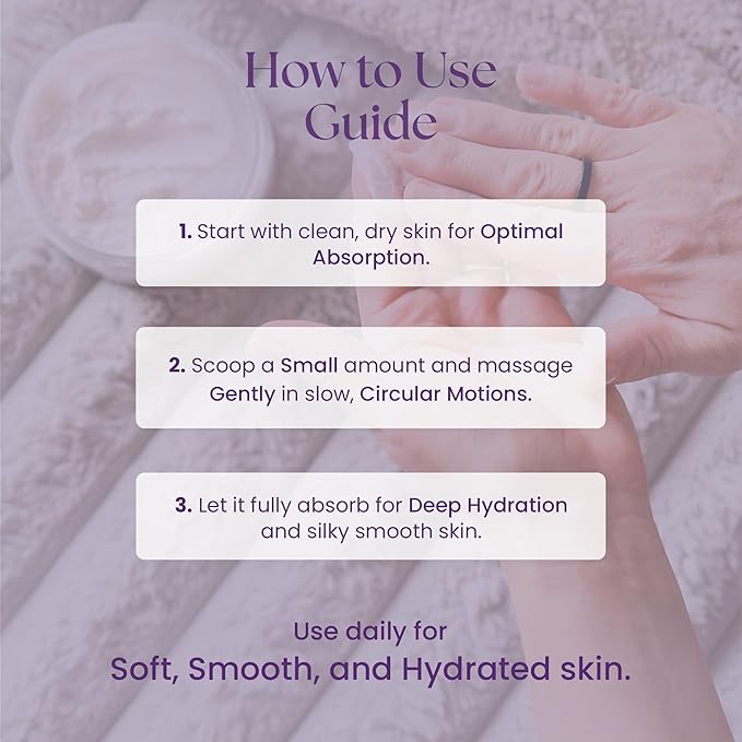 - For best results, apply a small amount of this whipped body butter to clean, dry skin. Gently massage in slow, circular motions to ensure full absorption. Use daily for long-lasting hydration and a soft, rejuvenated feel.