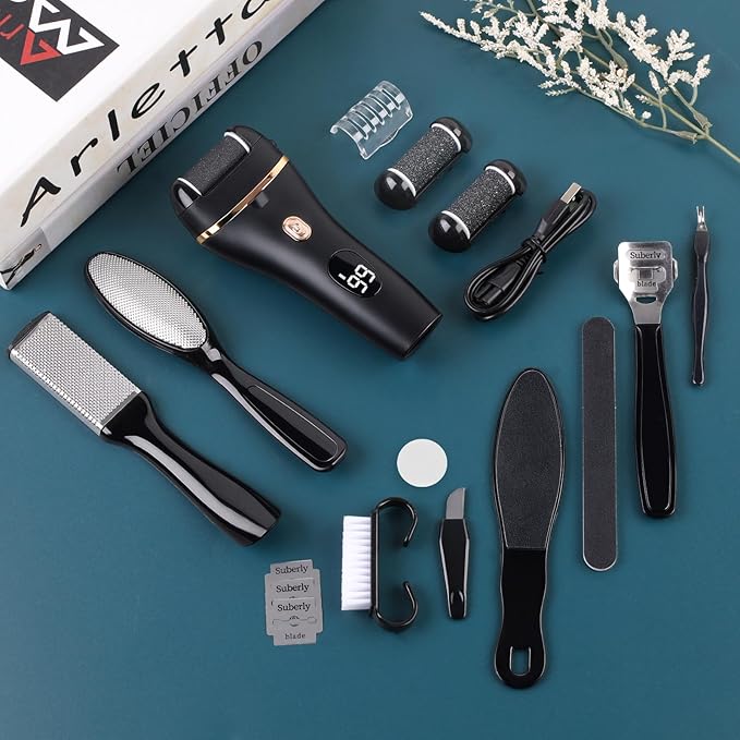 - 【17 in 1 Pedicure Kit】17 in 1 Professional Electric Callus Remover Pedicure Kit, the pedicure kit contains 17 tools, including Electric Callus Remover x1, Different Roller Heads x3, USB-A Charging Cable x1, Cleaning Brush x1, Roller Heads Protector x1, Stainless steel coarse file x1, Stainless Steel Fine File x1, Nail File x1, Cuticle Fork x1, Foot Brush for Pedicure x1, Scraping Knife x1, Replacement Blades x3, Nail Brush x1, etc. Different set to meet your different needs.