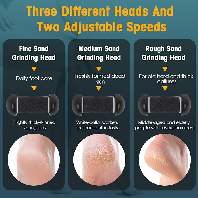 - 【3 Different Roller Heads 】Different Roller Heads are suitable for the callus of hands, cocked dead skin and more delicate skin care. Fine Roller Head is suitable for the callus of hands, cocked dead skin and more delicate skin care. Regular Roller Head is suitable for the newly formed callus and normal skin care. And Rougher Roller Head is suitable for stubborn thick callus and the dead skin.