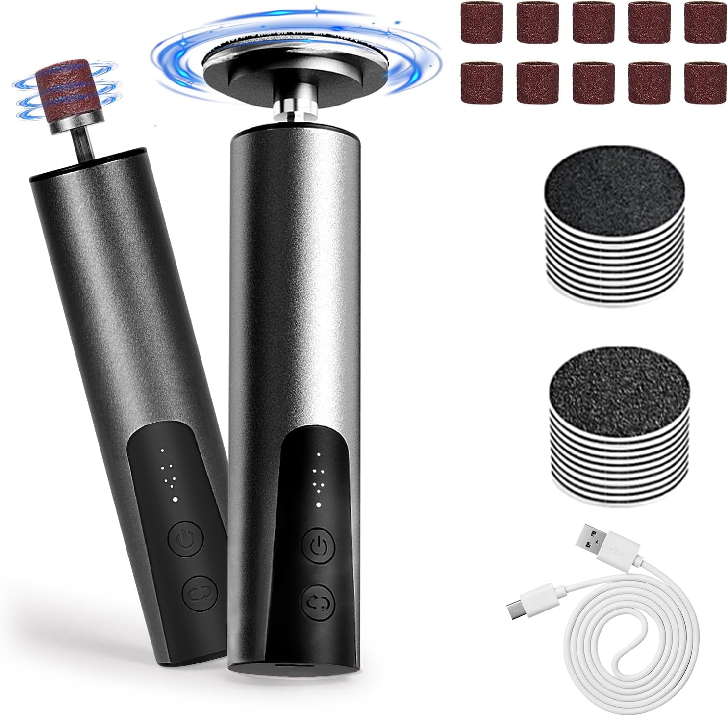 - Package Includes】:5.9-inch device × 1,USB charging cable × 1,Premium metal heads × 2 (Callus mode / Nail mode),80 grit for calluses ×10,120 grit for sensitive areas ×10,Ring sandpaper for nail polishing × 10,User manual × 1