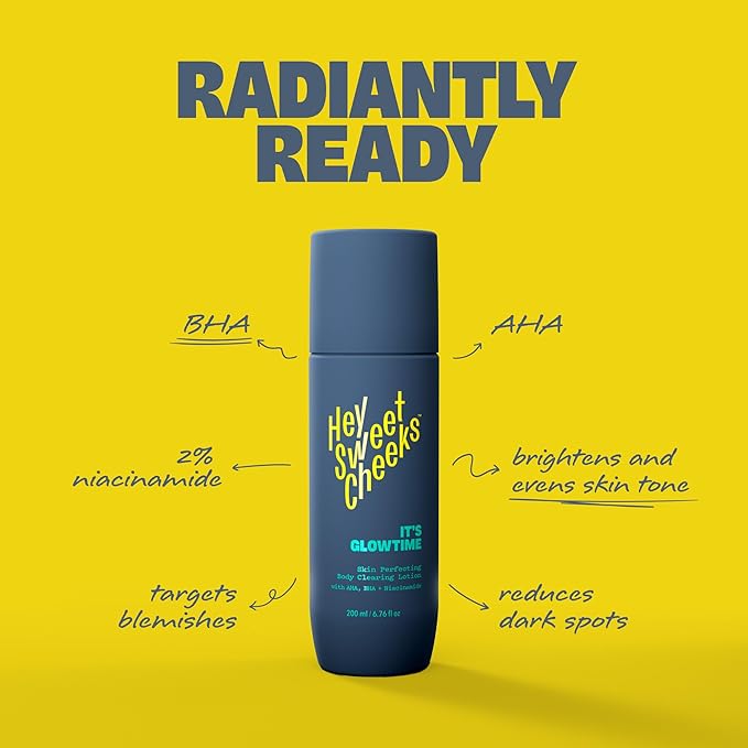 Skin Perfecting Body Blemish Treatment Lotion, AHA & BHA Glycolic Acid Body Lotion for Butt Blemish, Dark Spots, and Radiant Glow, It's Glowtime by Hey Sweet Cheeks, 6.76 oz