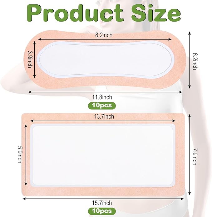 - Multi-size Design: 10 pcs in extra large size and 10 pcs in neck size; The former size, 40 x 20 cm/15.7 x 7.8'', fits the waist of most people's body types and also fits other large areas such as the liver, back, arms, legs, etc. The latter size, 30 x 11 cm/11.8 x 4.3'', is designed to fit the curve of the neck and can also be applied in other small areas such as joints, wrist, abdomen, calf, etc. The self-adhesive castor oil wrap does not require additional binding, making it more convenient