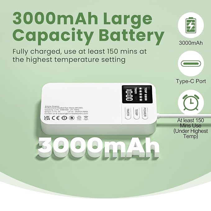 - 【3000mAh Large Capacity Battery】For enhanced safety, the 3000mAh rechargeable battery is located on the controller, which is connected to the eye mask and lasts for over 150 minutes on a full charge.