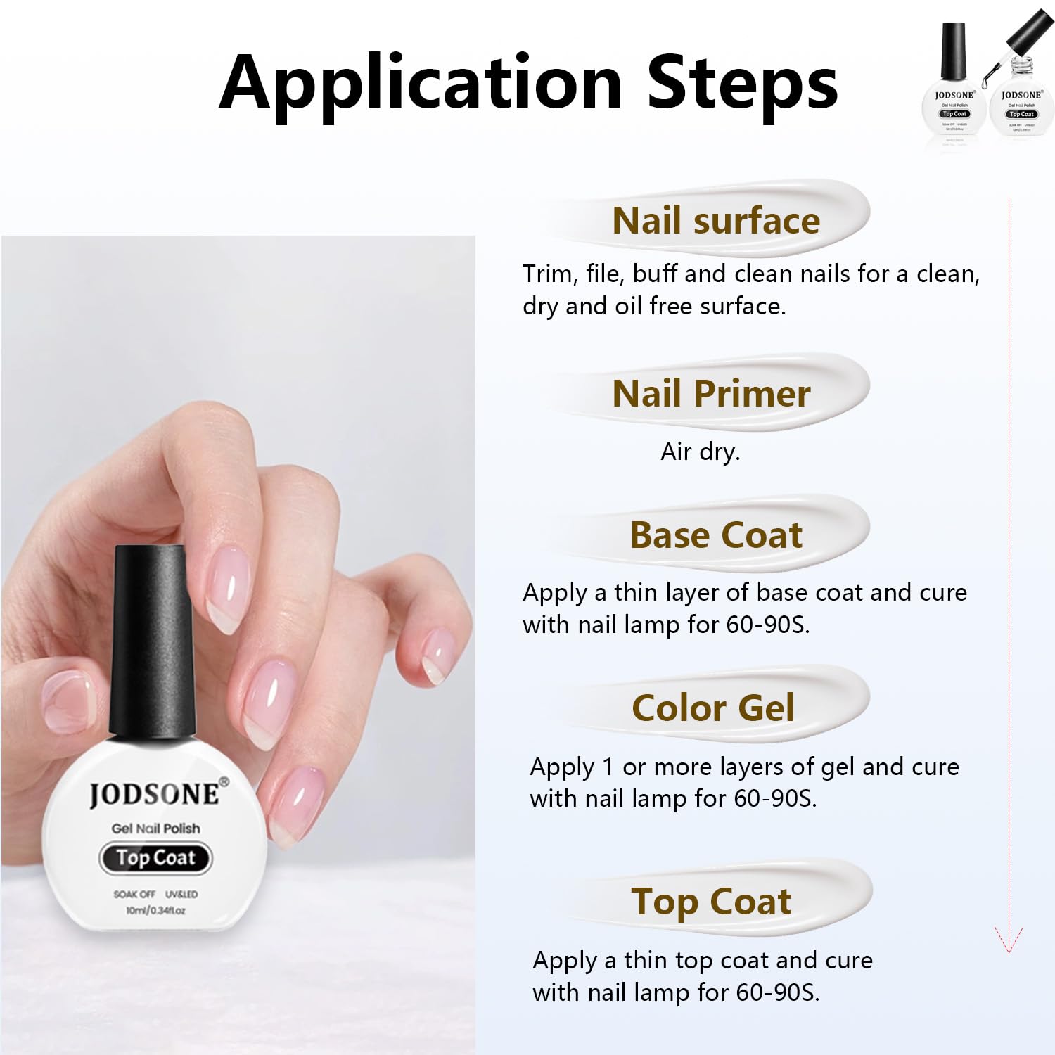 JODSONE 2Pcs 10ml No Wipe Gel Top Coat Clear Glossy Shine Finish Long Lasting No Soak Off Requires U V Lamp Curing Perfect for Salon and DIY Nail Art Design