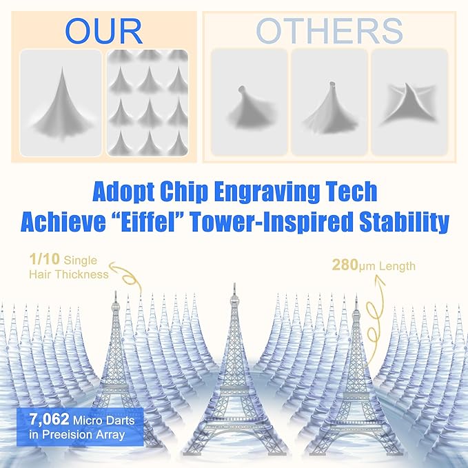 - 【Micro-Dissolving Stability Architecture】 Inspired by the structural stability of the Eiffel Tower, our micro-dissolving are shaped using micron-scale chip-carving technology. Each unit measures 280μm in length with a perfectly engineered top, ensuring precise delivery of Multi-Peptide and Hyaluronic Acid to targeted wrinkle zones for visible smoothing effects