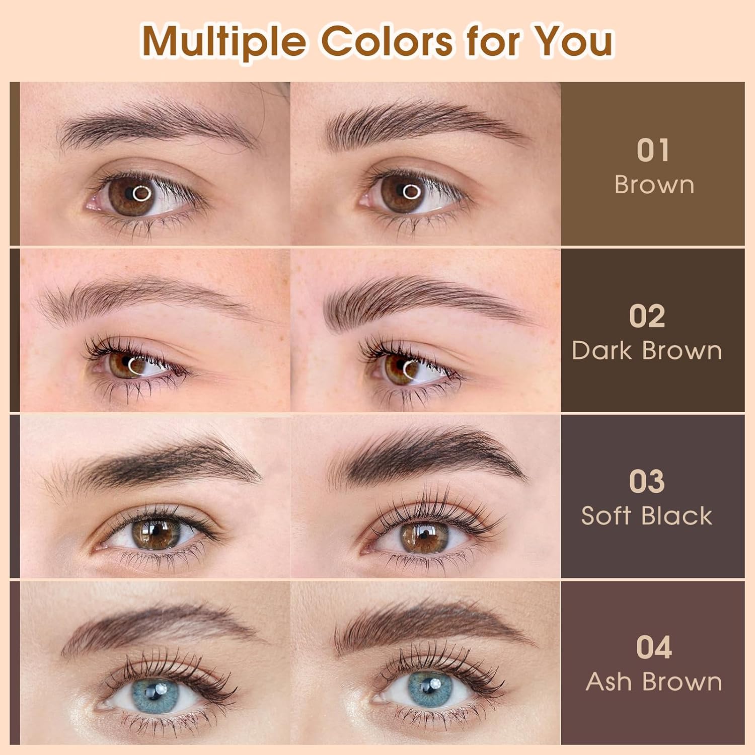 - ✔ 4 Natural Shades to Match Every Hair Color: 01 Brown, 02 Dark Brown, 03 Soft Black, 04 Ash Brown – from soft to bold brows, these smudge-proof shades offer a perfect match for all skin tones and hair colors