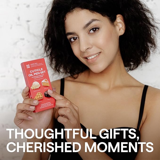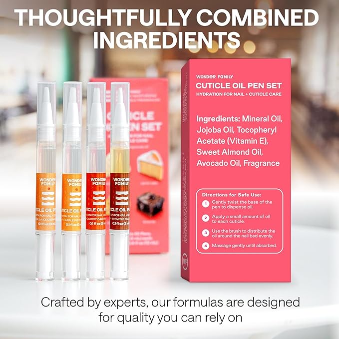- CUTICLE CARE KIT WITH DESSERT SCENTS – Our cuticle care kit features 4 deliciously scented cuticle oil pens: brownie, carrot cake, vanilla ice cream & apple pie. Each cuticle oil pen for nails provides daily cuticle softener benefits and boosts nail care with essential nail vitamins.