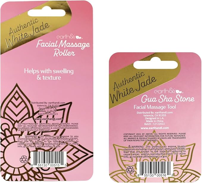 Earth & I White Jade Roller & Face Guasha Set 2pc, at Home Spa Essentials, Women Self Care, Face Tool for Lymphatic Drainage, Gua Sha Roller, Gusha, Facial Gua Sha Tool, Spa Accessories for Women