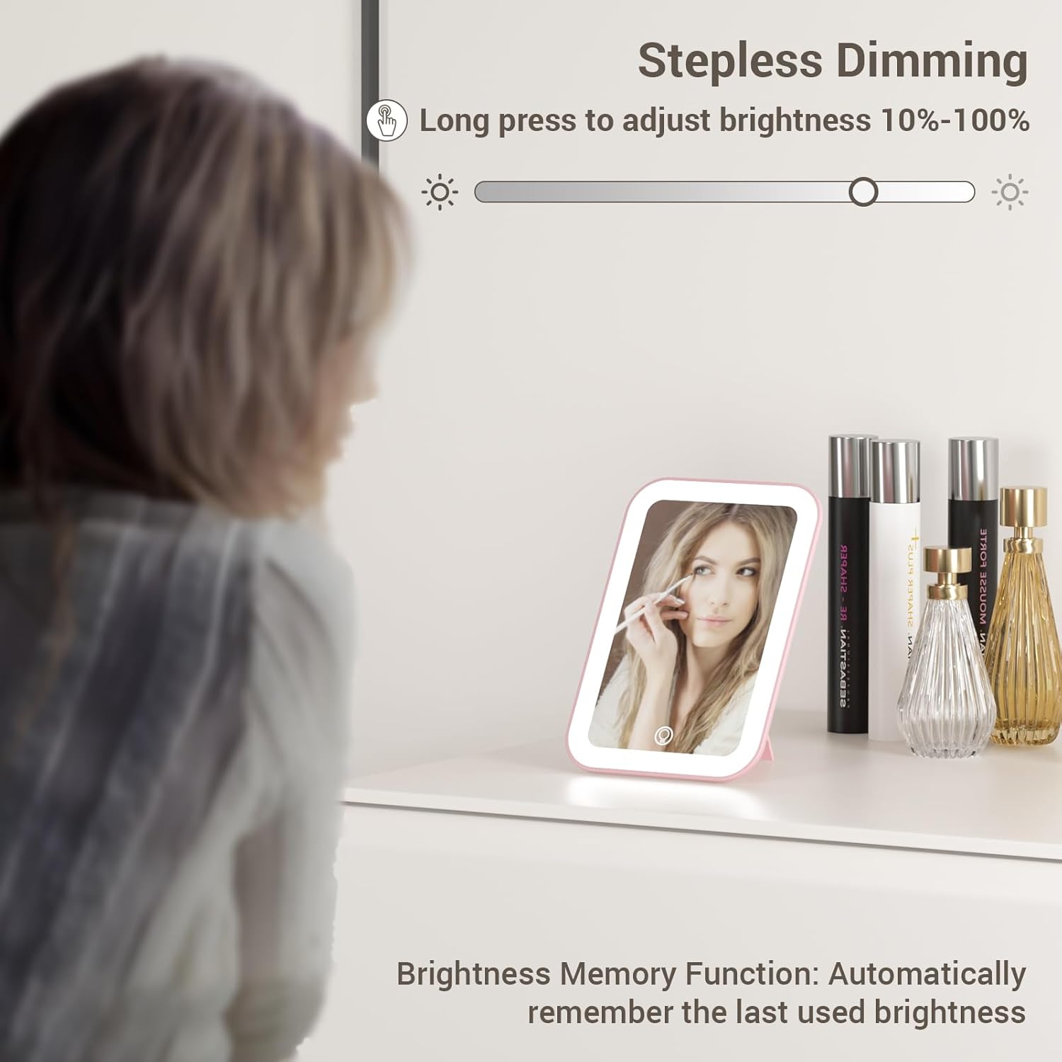 - 【Dimmable 3-Color Lighting】Click the touch switch to change between 3 color temperatures (natural light, warm light, and white light). Long press for continuous dimming, providing soft, glare-free light. The vanity mirror features a brightness memory function that retains the brightness from the last use