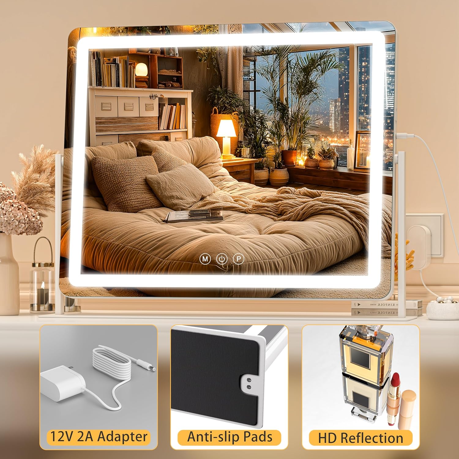 - 【Enhanced Large Size & Minimalistic Rounded Design】 The vanity mirror with provides a perfect upper body view. 360° rotation LED makeup mirror Adjust the mirror's angle effortlessly with its smooth swivel and tilt mechanism, ensuring you achieve the perfect viewing position every time.
