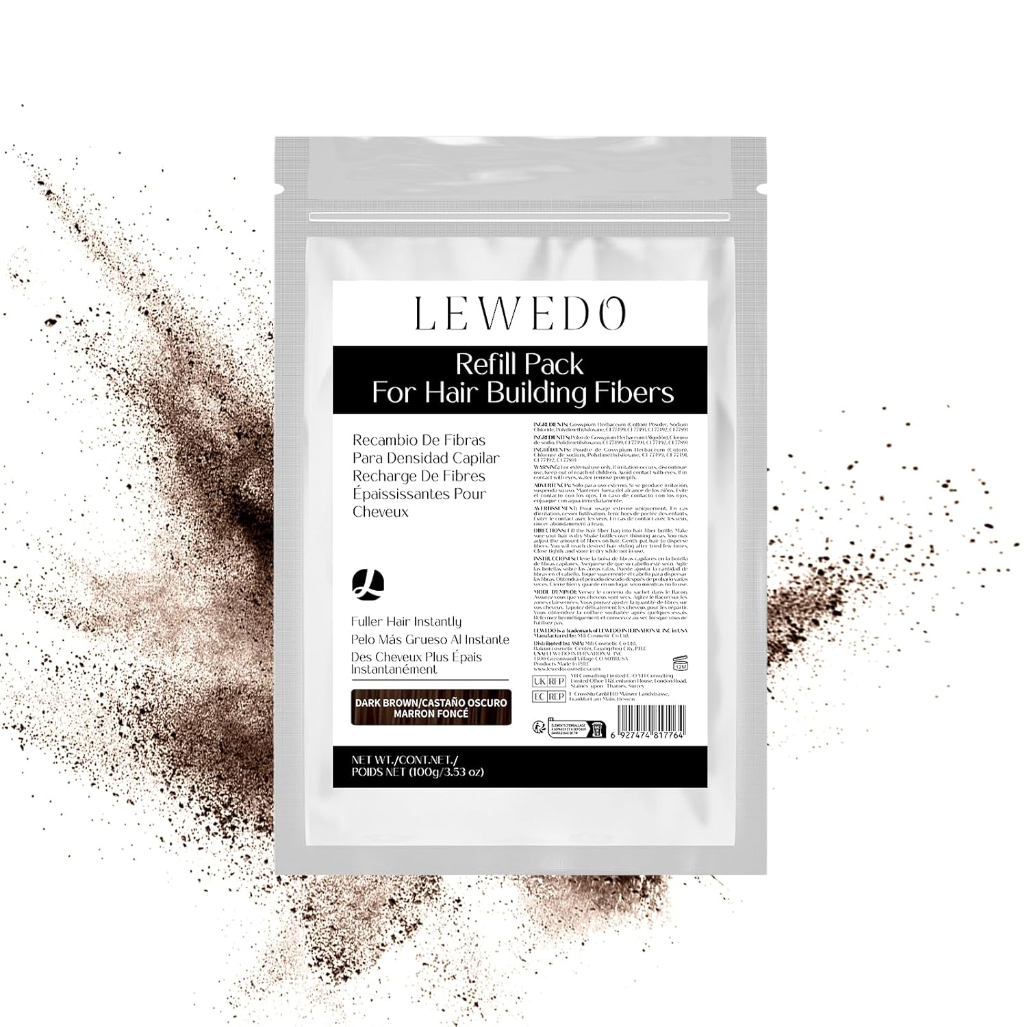 Hair Building Fibers Refill Pack - 100g Instant Thickening Fibers for Men & Women, Natural Cotton Powder, Wind/Rain Resistant, For All Hair Fiber Applicator Bottles (Dark brown)