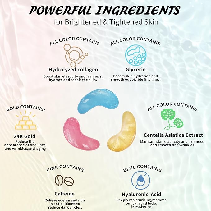 • Safe & Effective Ingredients: Our formula combines collagen, hyaluronic acid, caffeine, and a blend of natural plant extracts. These ingredients deeply repair and soothe the delicate skin around your eyes, protecting and rejuvenating without irritation. The ingredients of our under eye patches for dark circles and puffy eyes are vegan, sulfate-free, and gentle on all skin types.