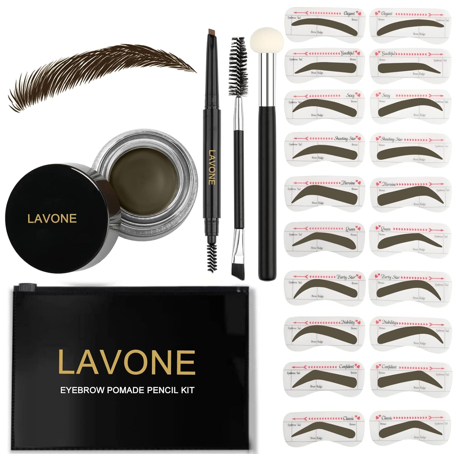 - [What’s in the eyebrow kit]: LAVONE makeup eyebrow kit includes brow pencil, eyebrow powder (color: ebony), 20 eyebrow stencils (10 different shapes), a sponge applicator, a dual precision brush and a zipper pouch for on the go.
