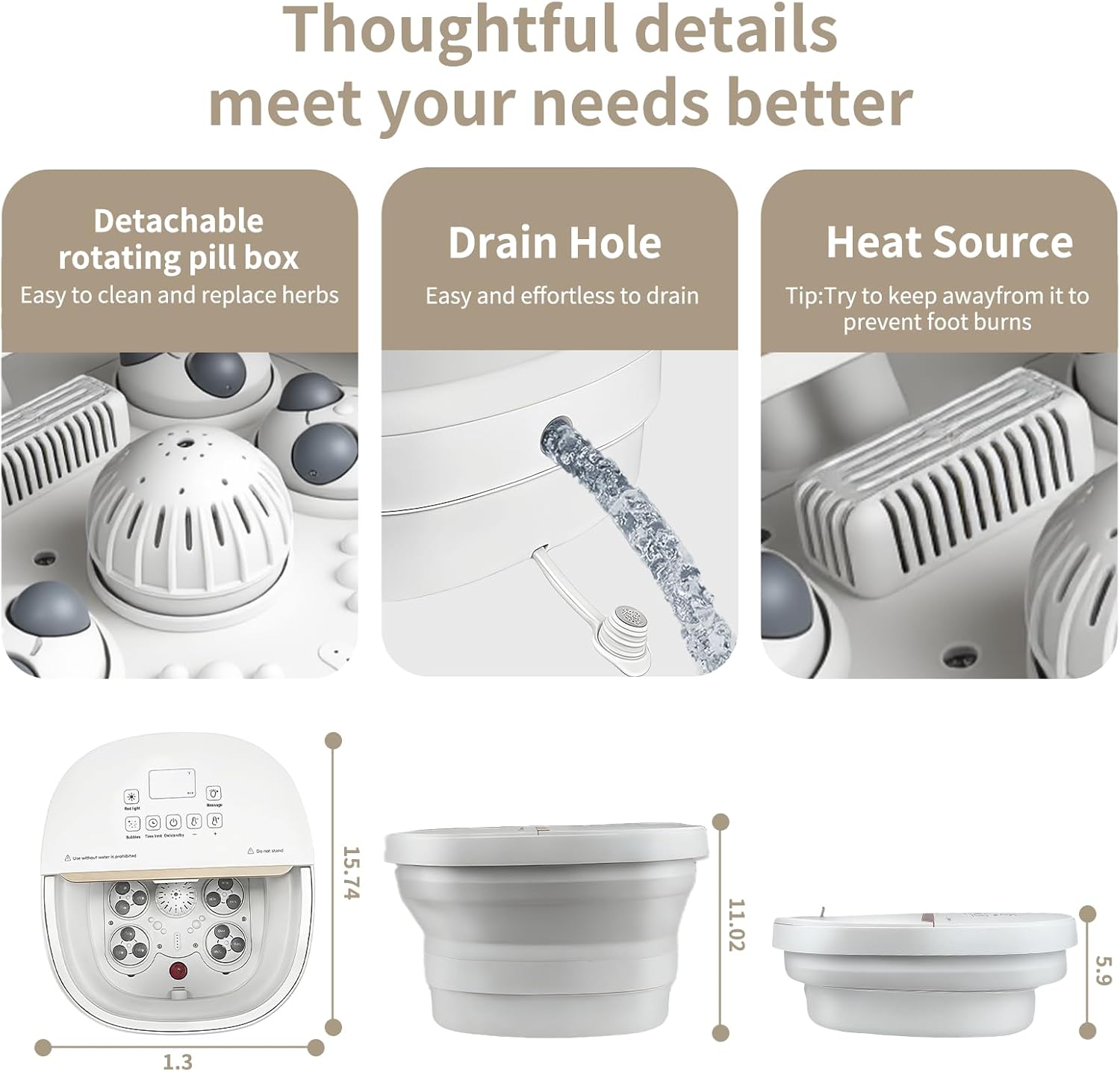 - LED Display & Timer: The temperature sensor accurately monitors the temperature of the water, and the bottom LED screen displays the real-time temperature or the set temperature. Built-in timer can be set from 10 to 60 minutes for a relaxing foot spa after a tiring day of work.