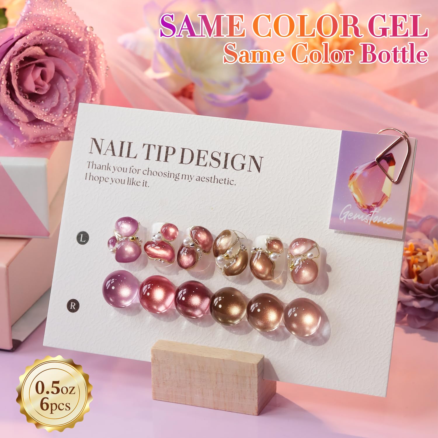 - 6 Pcs Same Color Same Bottle Gel Polish: 6pcs 15ml gel polish for all season, will come with color swatches.These gel polish kit need to be cured under UV or LED Lamp for 60-120s. Must apply with Base Gel and Top Coat. Please shake the bottle or warm it with hot water before use, to acheive a better effect.